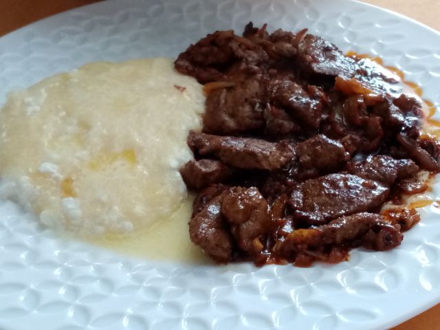 Pražena jetrca, polenta / grez; mešana solata; jagodna rolada