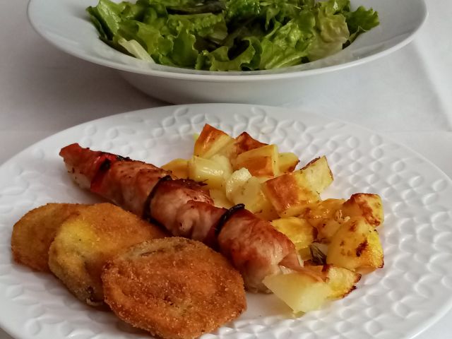 Goveja juhica; pečen krompir, piščančje nabodalo, panirani malancani; zelena solata s stročjim fižolom