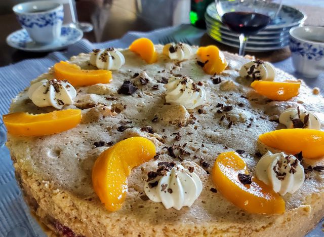 Sladica - njeno veličanstvo šarlota (ta prava, s stepanjem rumenjakov nad paro, vlivanje vročega sirupa v sneg beljakov, dodatek sladke smetane, pa kremo pobarvat v tri barve, da je na koncu marmoriran vzorec, dodani še namočeni koščki biskvita, koščki sadja in orehov ...). Sem jo pa dala kar v tortni model, čeprav bi morala biti v psodicaha za mini šarklje ali v modelu kot za šarkelj ... pa ga nisem našla.