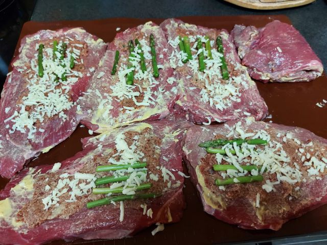 Mase je bilo veliko, pa sem na zrezke, ki sem jih čez noč pustila v mešanici gorčice, olja in malo rdečega vina na tanko premazala z jetrno zmesjo, dodala narezane šparglje, potresla z malo sira in jih le prepognila ter zaprla s kovinsko iglo. Potresla z moko in opekla na olju, jih dala na toplo, na maščobo pa čebulo in malo korenja, solila, poprala in dodala malo vina, potem pa zrezke nazaj v omako in na majhnem ognju pustila uro in pol. Presenetljivo dobro so izpadli, pa še mehki za povrh (jaz sem sicer mojster za naredit trde zrezke ... ne glede na meso). Priloga - pire krompir z graškom (krompir sem kihala kar z ostanki špargljev, ki sem jih potem odstranila). Pa solata - zelena in mešana iz rdečega in belega zelja.