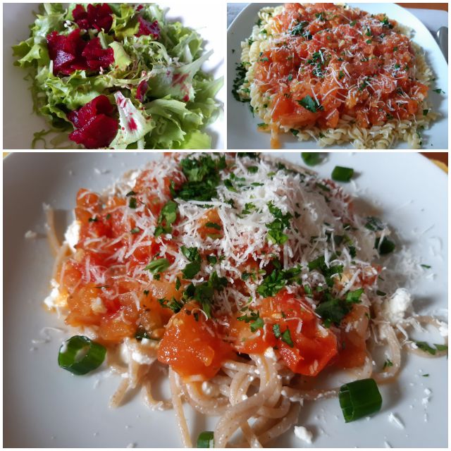 Testenine s paradižnikovo omako, zame in za moža z dodatkom mlade čebule in skute, mlado zelje z berivko in rdečo peso.