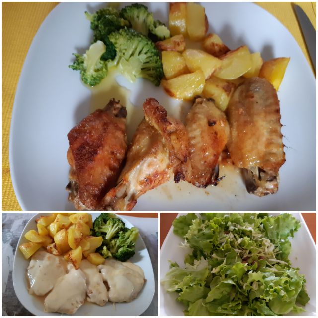 Včeraj pečen krompir, pečene perutke, zrezki s sirom, solata