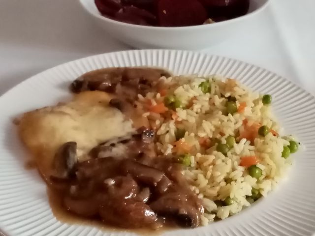 Korenčkova juhica; pišč. file v šampinjonovi omaki, basmati riž s korenčkom in grahom; rdeča pesa