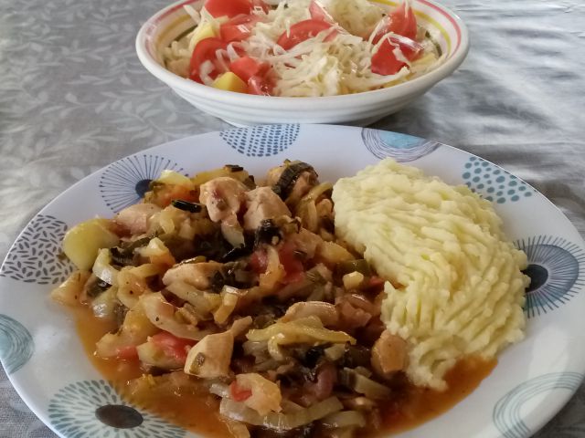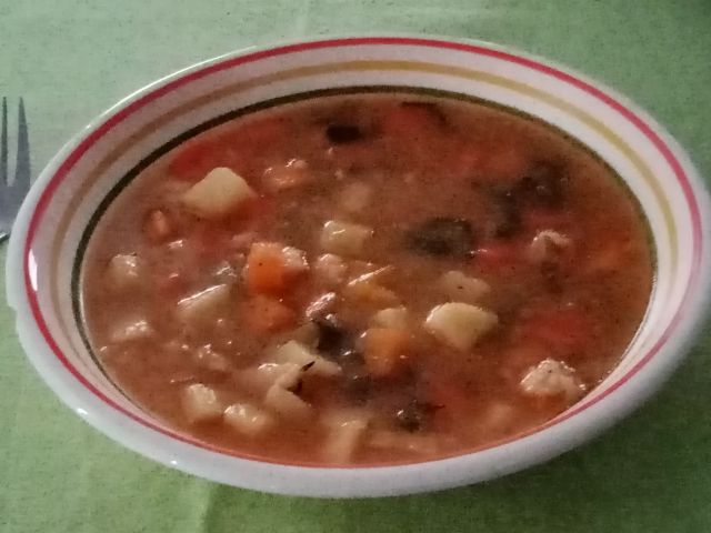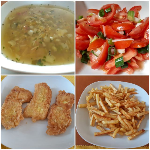 Preostanek juhe od včeraj, pariški zrezki, pomfri, paradižnikova solata