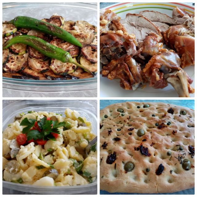Pečen odojček, krompirjeva solata, bučke in malancani s česnom, fokača