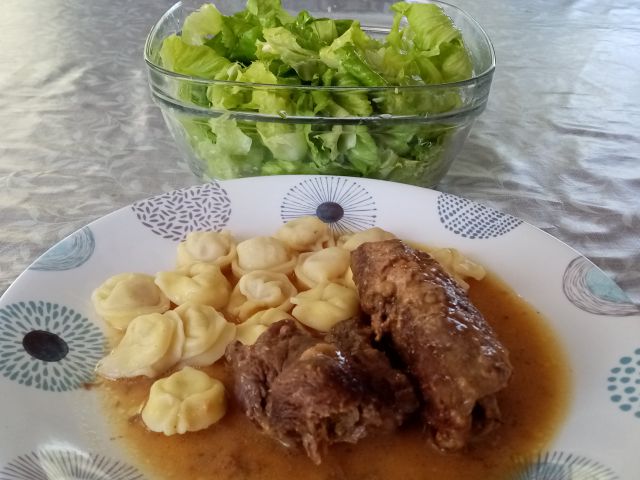 Nadevani goveji ptički, ravioli, zelena solata