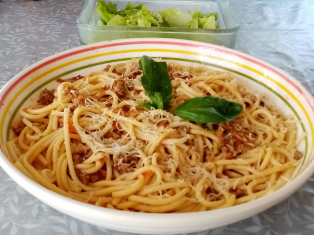 Debeli špageti, z luknjico, bologneze omaka; zelena solata z zeljem; jagode