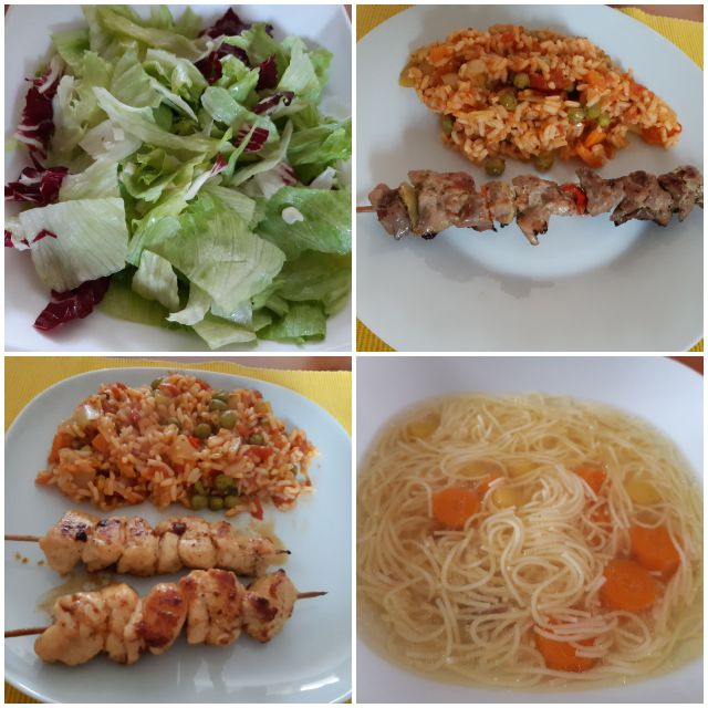 Včeraj pizze, danes goveja juha z rezanci, nabodala, džuveč riž, solata