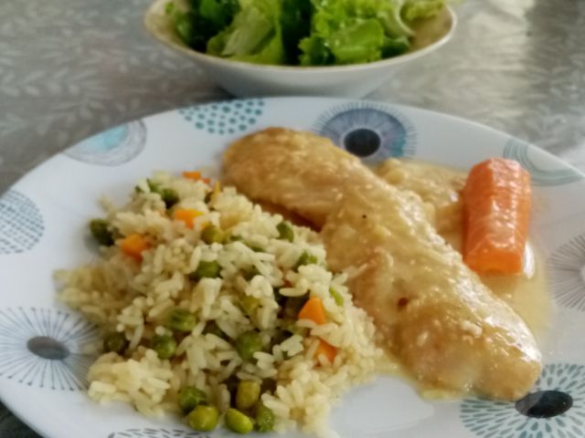 Piščančji file v omaki, rizi-bizi, zelena solata; lubenica