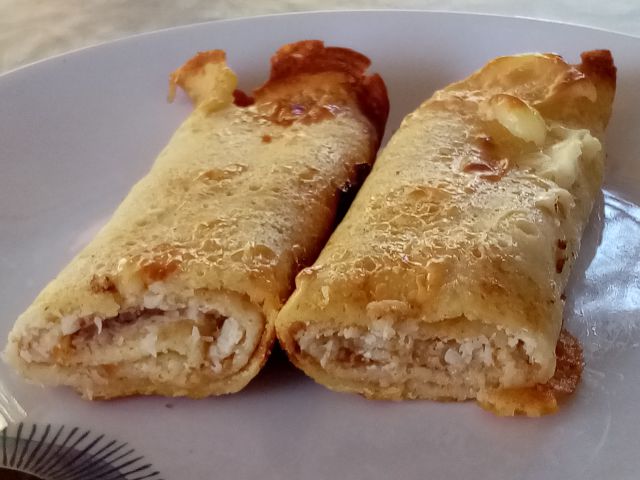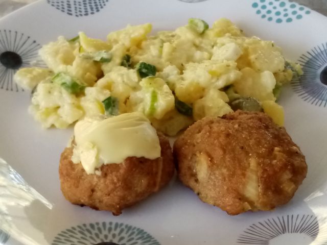 Krompirjeva solata, faširanci; zapečene palačinke s skuto in kokosom