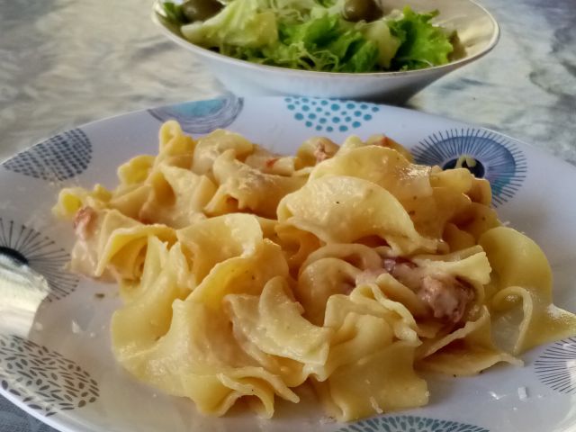 Široki rezanci z omaki in prepraženo slanino; zeljnata in zelena solata