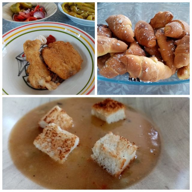 Juhica s krutoni; pohan mesek, mešana solata, pečena paprika s česnom; rogljički z marmelado in nutelo