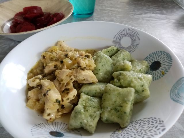 Korenčkova juhica; špinačni njoki, puranji trakci z bučko; rdeča pesa; ostanki flancov od zajtrka
