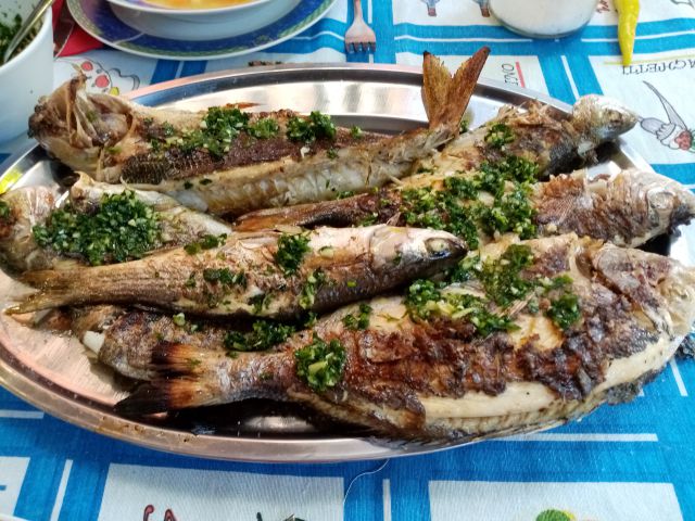 Ribja juhica; ribice, krompirjeva solata; lubenica, grozdje