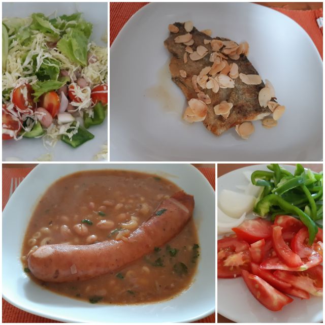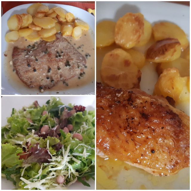 Včeraj goveja juha z rezanci, pečen kos piščanca zame, za moža zrezek v poprovi omaki, pečen krompir, solata