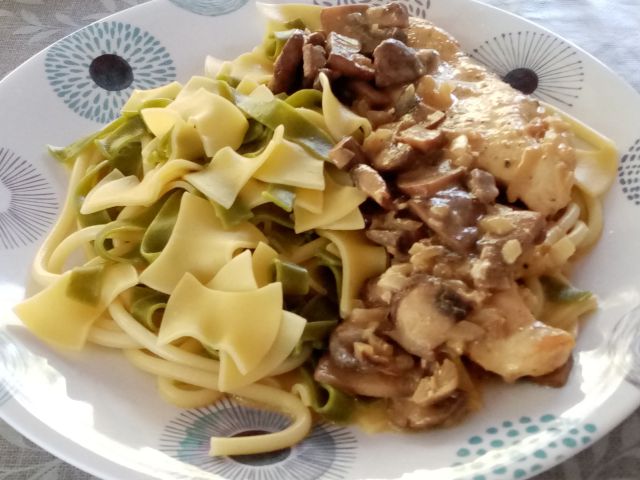 Pišč. zrezki v šampinjonovi omaki, ostanki rezancev in debelih špaget; kumarična solata z jogurtom, zelena solata