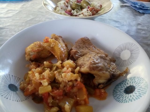 Đuveč, perutničke, vratovina, sv. ribica; mešana solata; zebrino pecivo