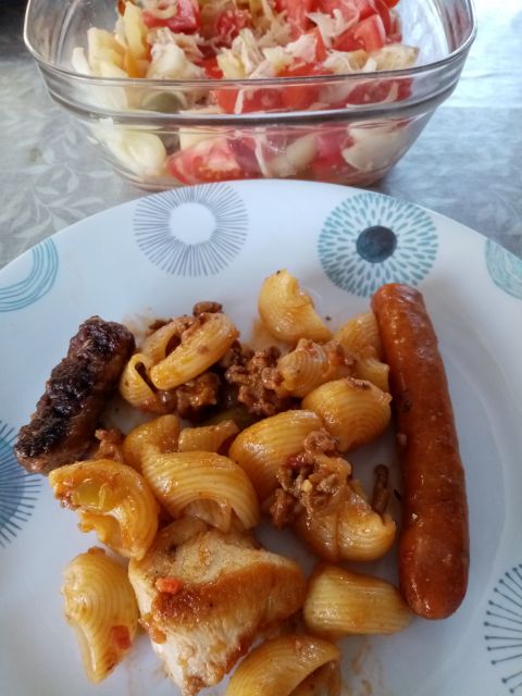 Juhica; makaronflajš; mešana solata