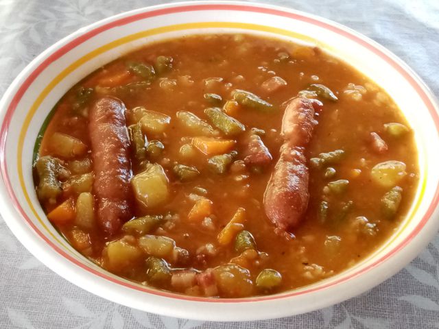 Stročji fižol "na žlico" z mini klobasami; lubenica