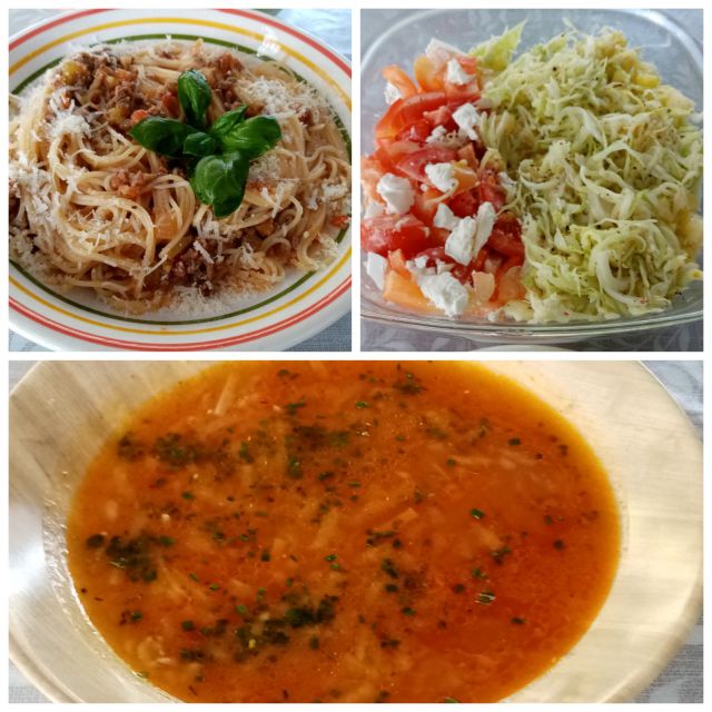 Juhica; špageti a la bologneze; mešana solata