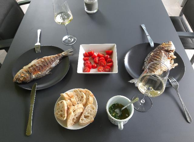 Že dlej časa vas berem, danes pa sem se odlocila, da tudi sama objavim. Včeraj pri nas orade iz žar plošče, bargeta, česnovo maslo, domači češnjevec.