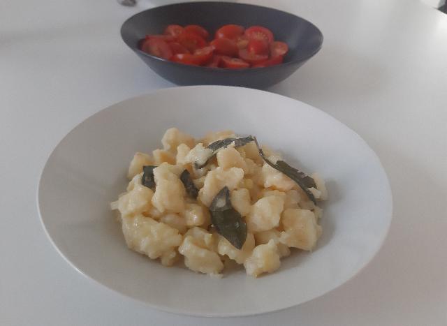 Domači (ne preveč posrečena oblika) njoki na rjavem maslu s hrusljavim žajblom, češnjev paradižnik z bučnim oljem.