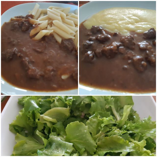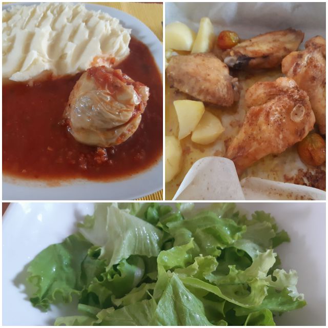 danes malo mešano- polnjena paprika iz zaloge, pire krompir, pečene perutničke, krompir, zelena solata