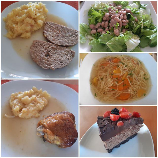 Danes: goveja juha z rezanci, pečen piščanec, mesna štruca, mlinci, pražen krompir, različne solate, pečene bučke in cheescake
