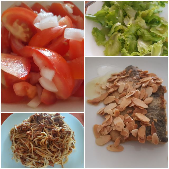 Včeraj za moja testenine bolognese, zame file postrvi z mandlji, solata