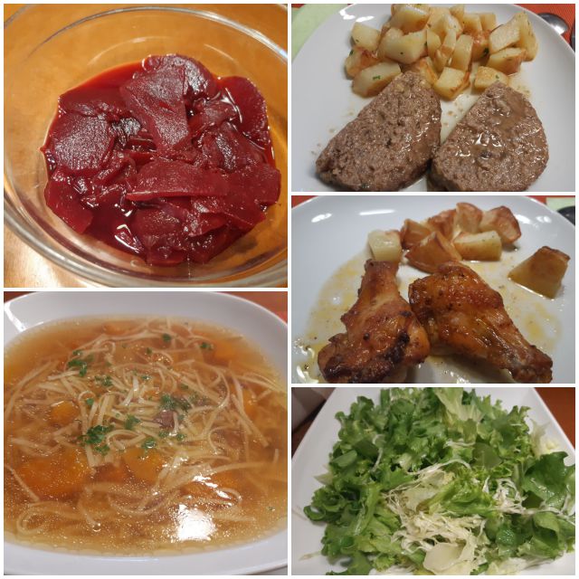 Danes goveja juha z rezanci, preostanek mesne štruce, perutničke, pečen krompir, solata, torta