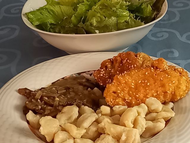 Bučna juhica; ščipanci, šampinjoni v omaki, panirano piščančje/vratovina; zelena solata