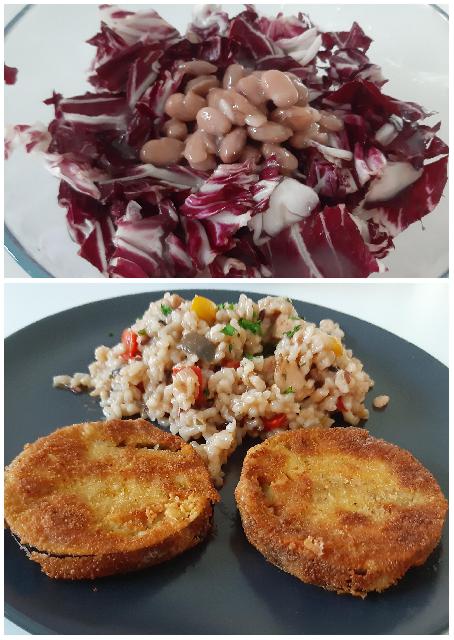 Piščančja rižota z divjim rižem z ocvrtimi melncani za naju z možem in pišč. fingrsi za sina, radič s fizolom: