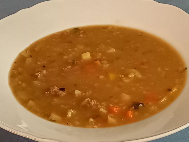 V petek za sina filana paprika iz zaloge, pire krompir. Za naju z možem goveja juha, hrenovka in paradižnikova solata.