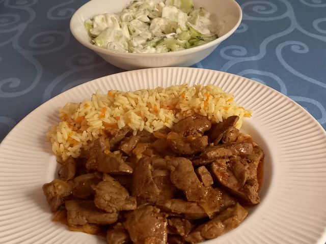 Pražena jetrca, basmati riž; kumarična solata z jogurtom