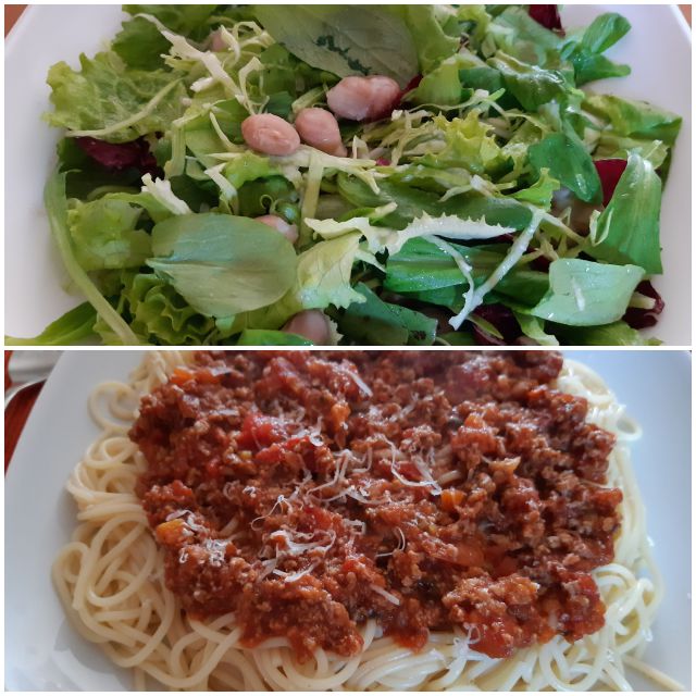 Danes bolognese omaka iz zaloge, špageti, solata s fižolom