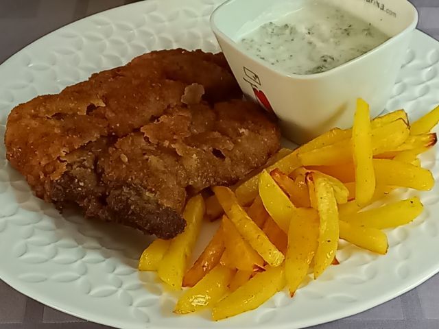 Podkrepljena juhica od včeraj; pomfri (iz pečice), telečji zrezek po dunajsko, smetanova omaka s kumaricami; zelena solata in radič