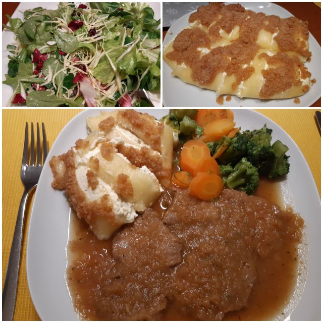 Danes telečji zrezki v omaki, skutni štruklji, zelenjava, solata