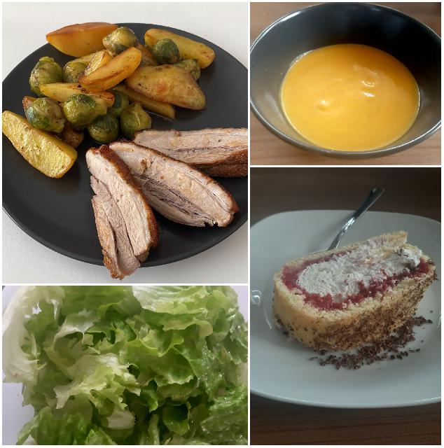 kremna juha s kolerabe, korenja in zelene, sv.pečenka, pečen krompir in pečen brstični ohrovt, solata, malinova rolada: