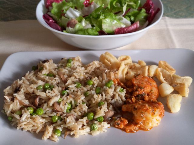 Basmati riž s šampinjoni in grahom, kozice na česnu, frigani kalamari; endivija in radič s krompirjem