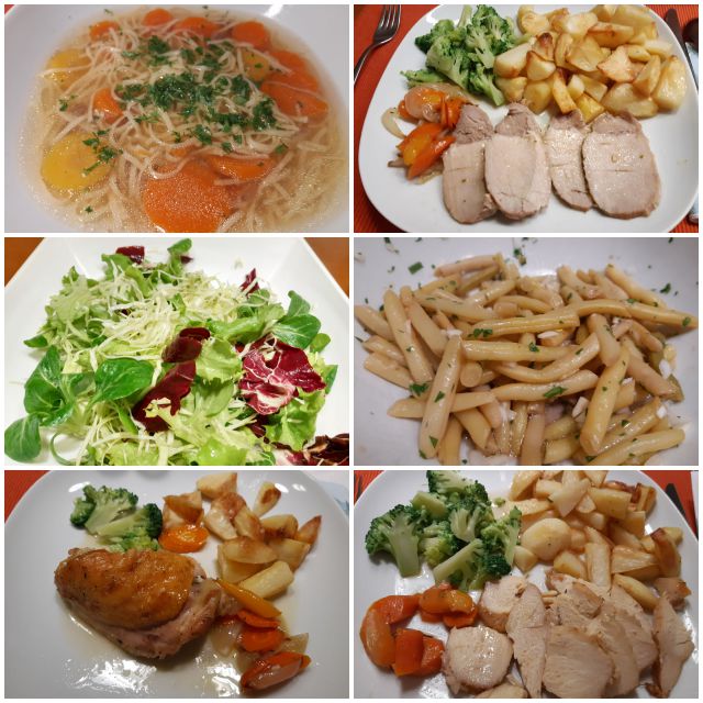 goveja juha z rezanci, svinjska pečenka, pišč.prsa, kos bedre, krompir, brokoli, solate