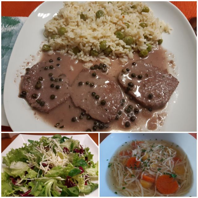 Goveja juha z rezanci, svinjina v omaki zelenega popra, zame ostanek perutnine, rizi bizi, solata.Za sina pa samo juha, ker je zbolel.