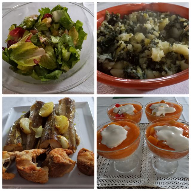 Goveja juhica; pečeni in paniran oslič, krompir z blitvo; endivija in radič s krompirjem in fižolom; jogurtno-kakijeva strjenka