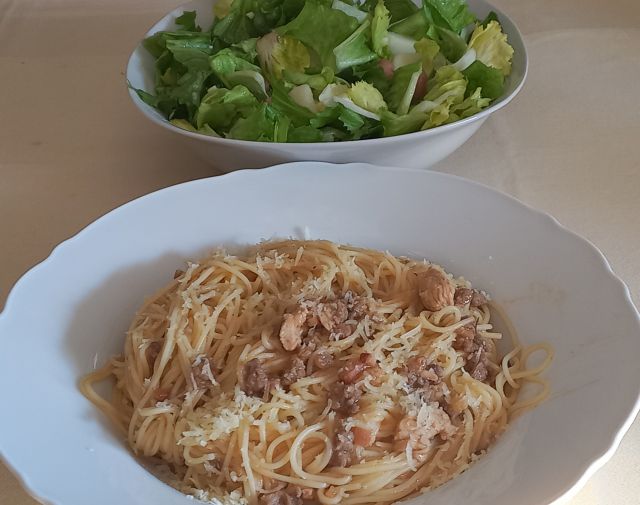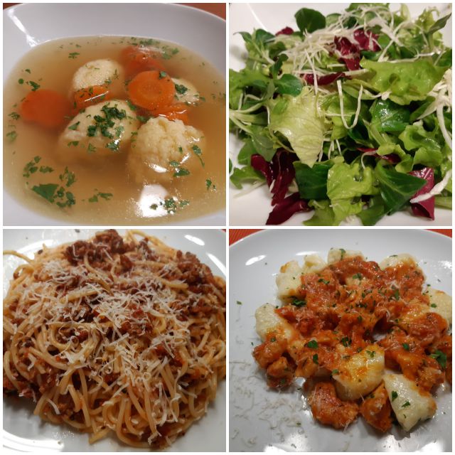 Danes goveja juha z zdrobovimi cmoki, špageti bolognese, zame skutini njoki z zelišči in piščančjo omako, solata
