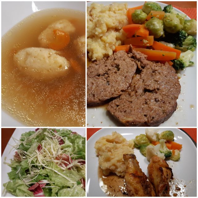 Danes še malo juhe z zdrobovimi cmoki od včeraj, mesna pečenka, perutke, pražen krompir, zelenjava, solata