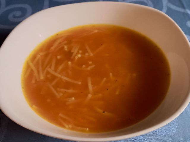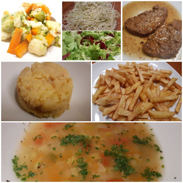 Za kosilo danes zdrobova juha s korenčkom, porom in grahom, ostanki pečenke, zelenjave, pražen krompir, pomfri, solati
