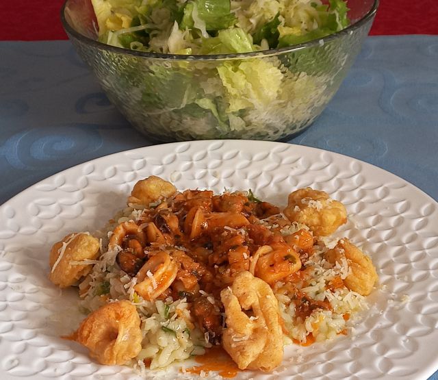 Morska rižota, še malo friganih kalamarov; endivija in zelje na solato