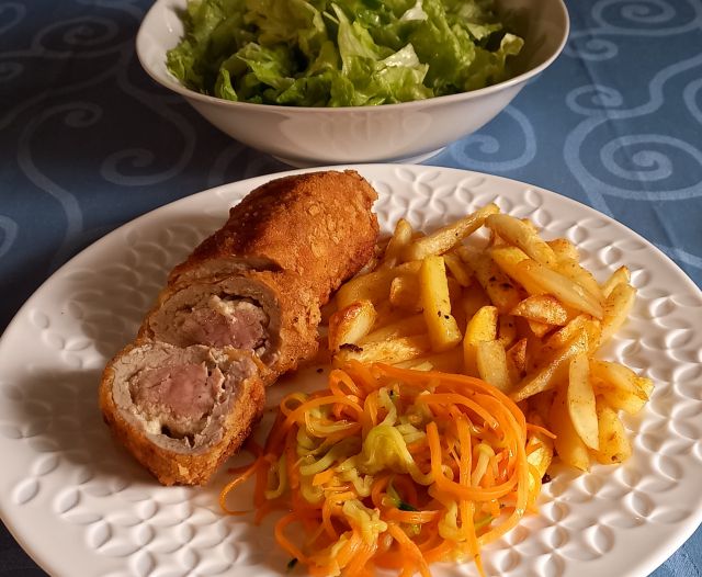 Bučno/korenčkova juhica; karađorđev zrezek, pomfri, bučke in korenček v voku; zelena solata