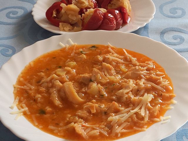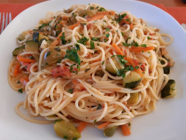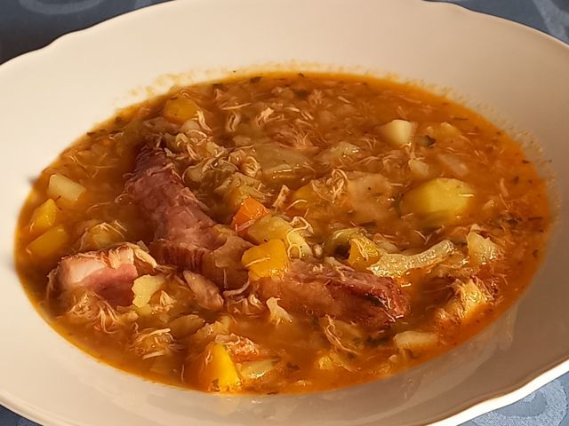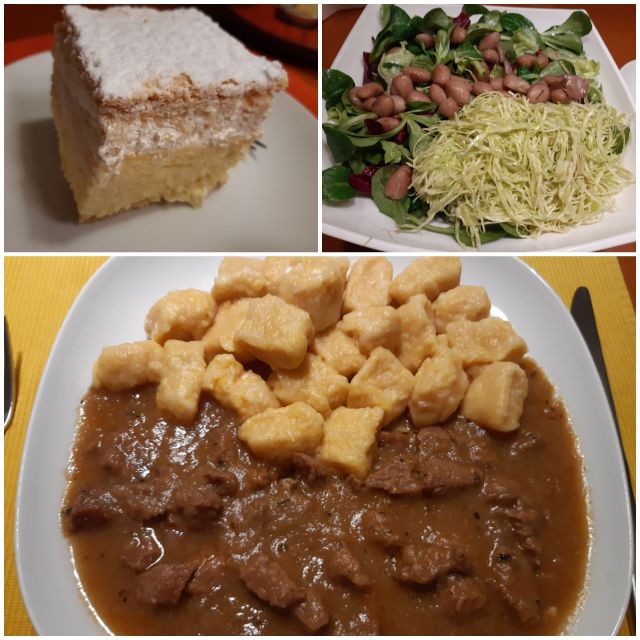 Že včeraj sem za danes skuhala telečji golaž, ker smo se šli potepat v naravo na sonček. Zraven bučno- skutni njoki, solata.