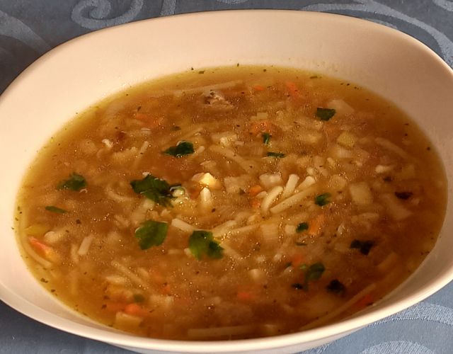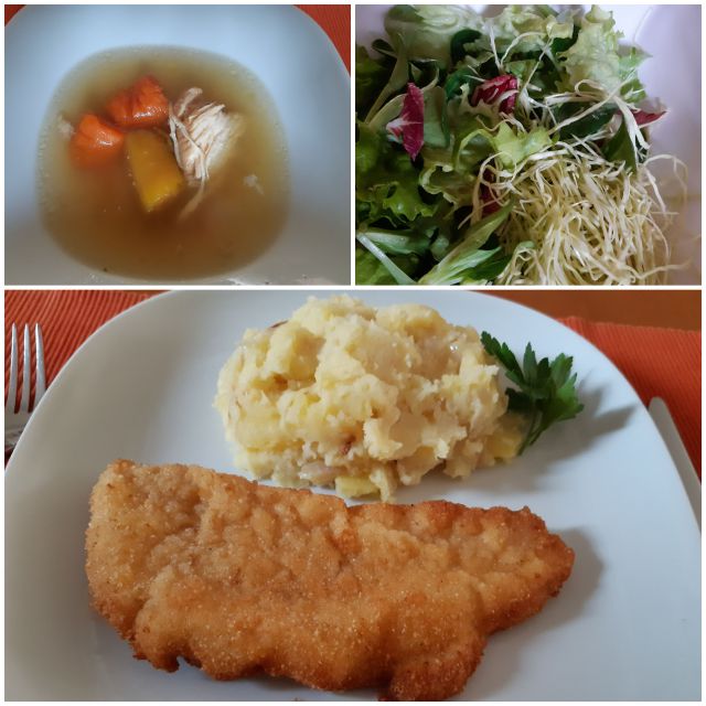 Danes kokošja juha zame, meso na dunajski način, pražen krompir, mešana solata