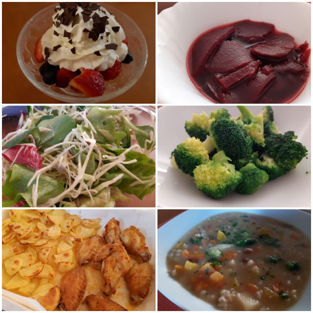 Malo pisano danes/ ričet iz zaloge, perutničke, pečen krompir, brokoli, solata, rdeča pesa, jagode in borovnice s smetano